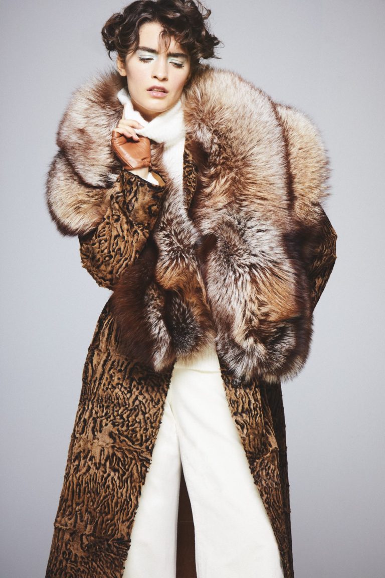 Elegante abrigo confeccionado en Swakara (astrakán del suroeste africano) planchado y napado, reconocido por su textura única y gran calidad. Modelo reversible, combinado con zorros argenté teñidos, que aportan volumen y sofisticación. Una pieza exclusiva, cálida y muy elegante