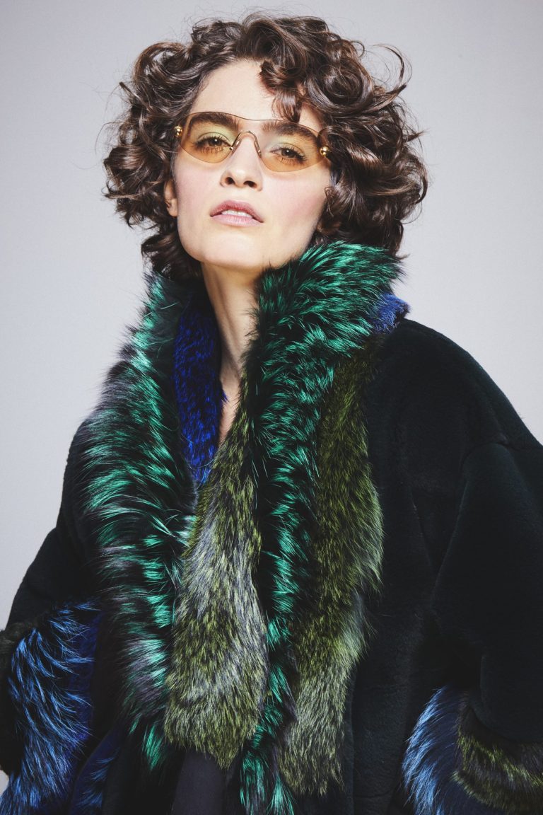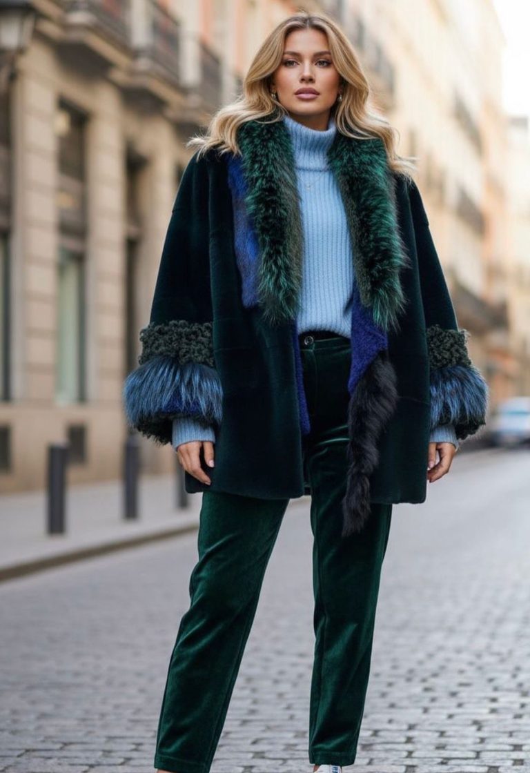 Abrigo fantasía en visón despinzado verde combinado con zorros argentes teñidos en tonos verde y azulón. Una pieza sofisticada que destaca por su mezcla de texturas, volumen y un elegante juego de color, perfecta para un look exclusivo y con personalidad