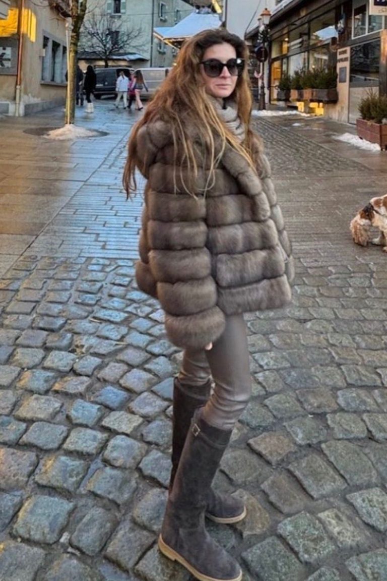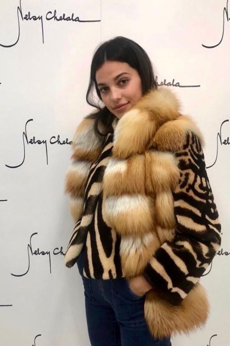 Nuestra querida clienta luciendo un elegante chaleco de zorros combinado con una chaqueta de visón estampado, una mezcla sofisticada que desprende estilo, personalidad y distinción.