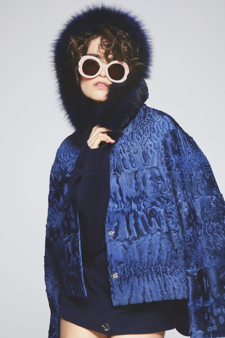 Elegante chaqueta confeccionada en Swakara de Nam en tono azul, ribeteada con zorro, que aporta contraste y sofisticación. Suave, ligera y cálida, una prenda exclusiva que combina lujo y estilo atemporal